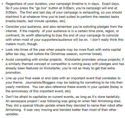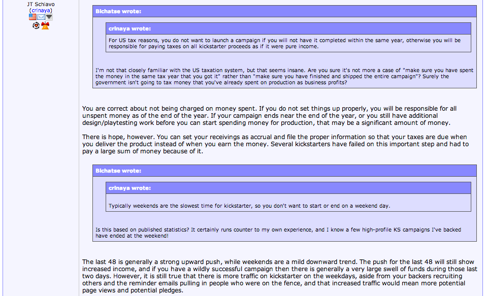 In the screenshot above (click it to enlarge) Schiavo argues that Kickstarter tends to see more traffic on weekdays, leading to less pledges on the weekend, and that another reason to be aware of the time of the year you plan to launch is that you could be liable for taxes in that year if you have unspent funds from the project. We went further into this in our “Kickstarter & Indiegogo Tax Implications” article.