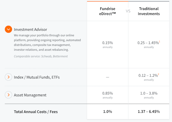There are two types of fees that Fundrise charges. The first comes in the form of an annual fee that goes towards asset management and investment advisor expenses.