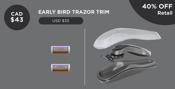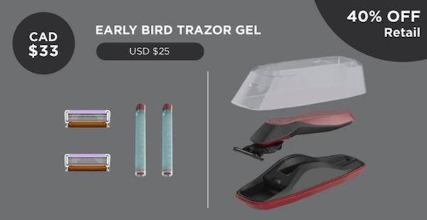 For the next 24 days, Trazor is available on Kickstarter with some great early-bird rewards. You can get started with only $25 USD which comes with the Trazor gel shaving system, 5 signature edge blades, gel cartridges, a razor stand, and a see-through travel case.